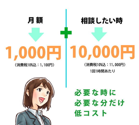 「低コストな月額会費+利用したい時だけ発生する低コストな相談料金」。=必要な時に必要な分だけ相談できるカタチ