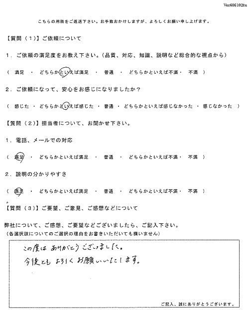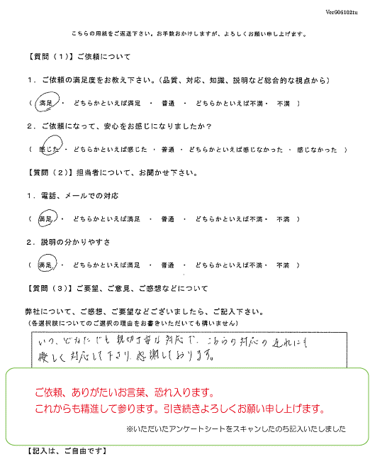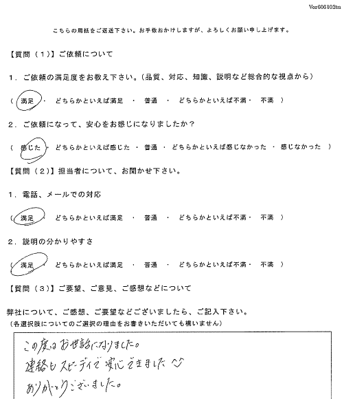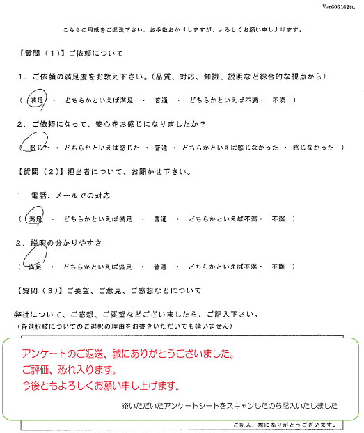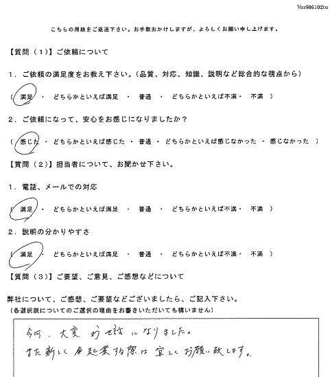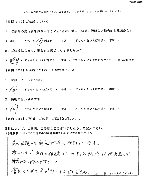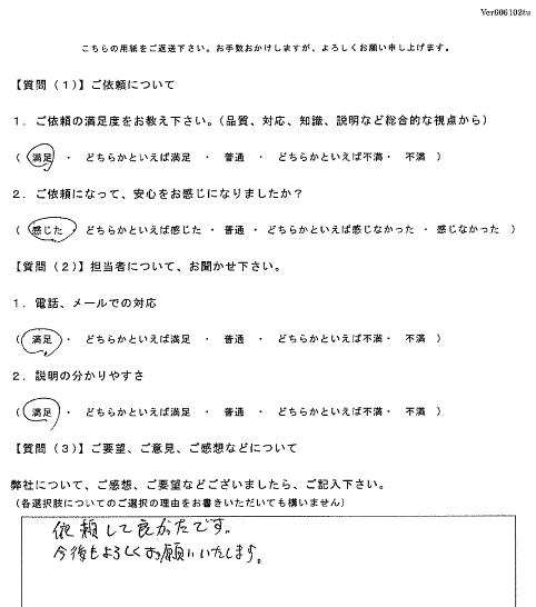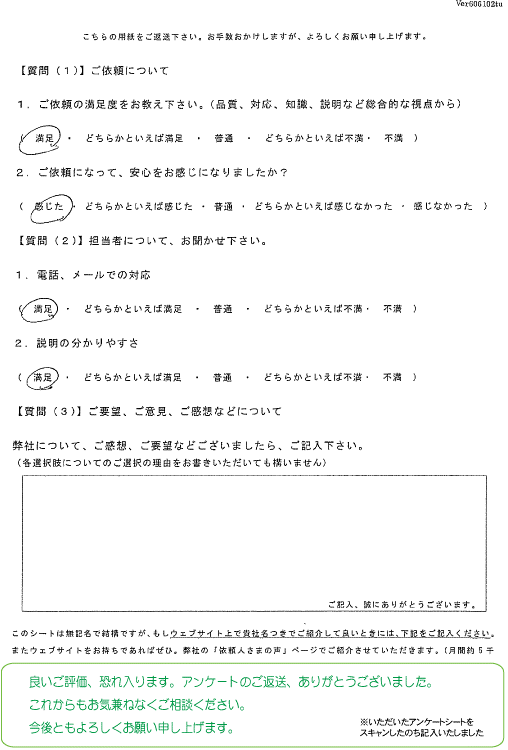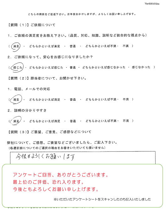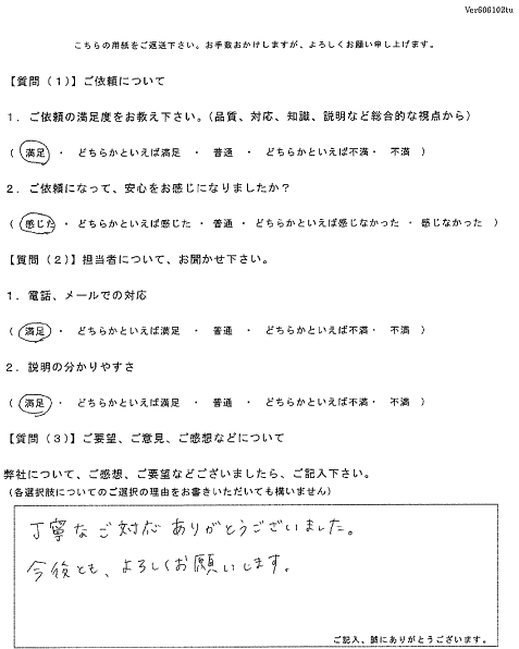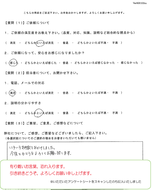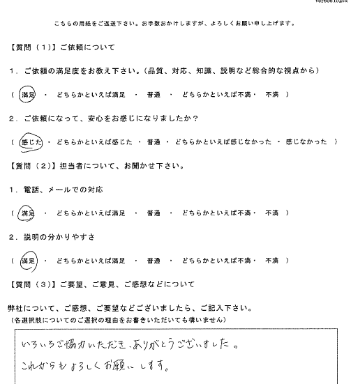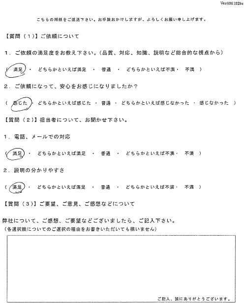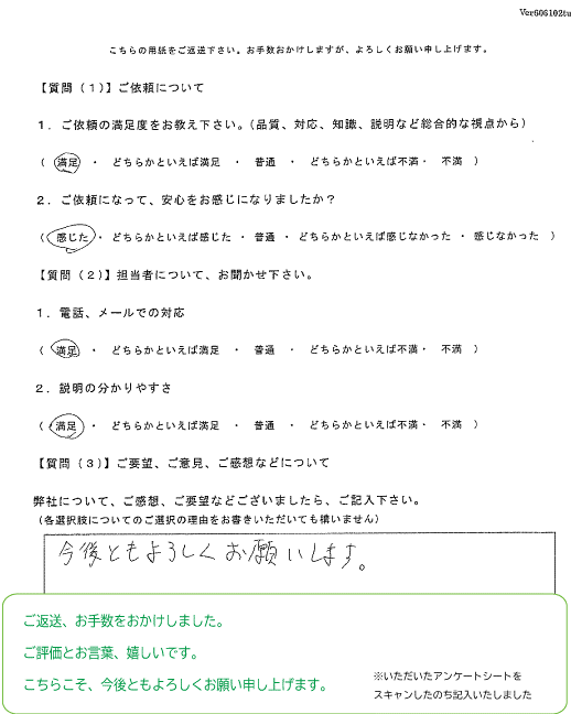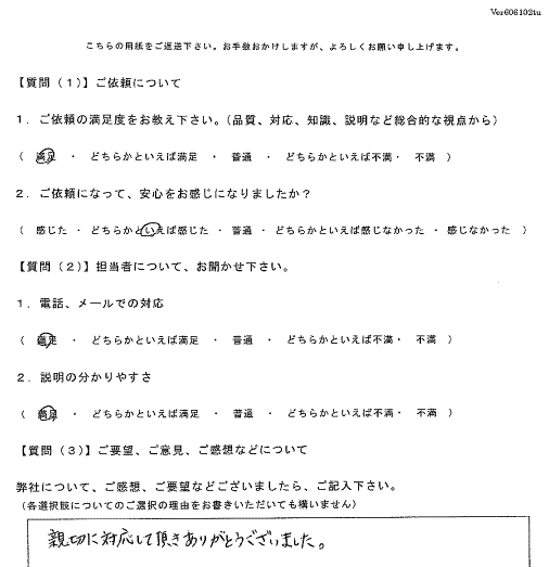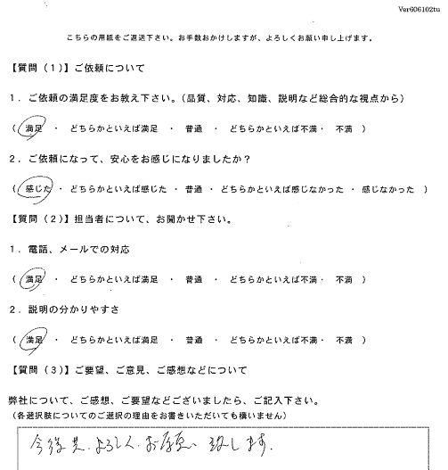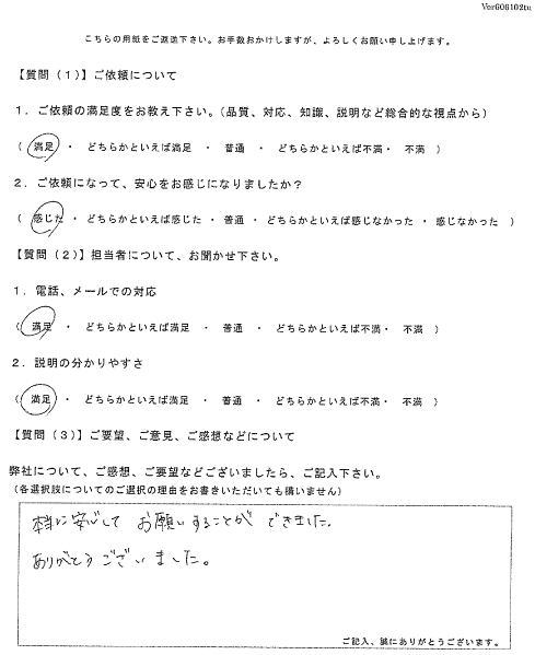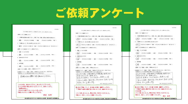 ご依頼完了後のアンケートです 良いご評価もそうでないご評価も公開しております 手続きが完了したあとに返送いただいたアンケートです。 良いご評価におごることなく、そうではないご評価に対しては、改善を継続してまいります。 ご依頼アンケート 大切な節目にご依頼くださり、ありがとうございます。